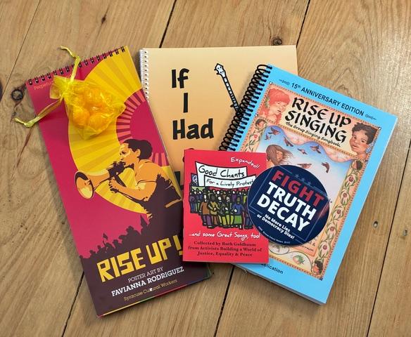 Looking for a gift for those beloved friends who are bravely working for a better world? Well look no further. This Rise Up! / Better World gift bundle includes a small Rise Up Singing songbook, our If I Had a Hammer songbook, the Good Chants pocket songbook, a "Rise Up!" perpetual calendar, and a "Fight Truth Decay" (4" square) sticker from Syracuse Cultural Workers. In addition, we include a tiny mesh bag of candy to bring to their next rally or gobble up right away. We all need some nourishment and encouragement, especially right now.